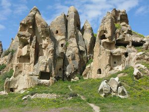 Несколько миллионов лет назад, еще в третичный период, в Анатолии произошло извержение вулкана Эрджиеш-Дагы — самой высокой горы Малой Азии. Потоки лавы, смешанной с пеплом, хлынули в долину Гереме и толстым слоем покрыли территорию в несколько тысяч квадратных километров. Потом за долгие века ветры унесли, дожди смыли легкие породы, а застывшая лава и спрессовавшийся пепел постепенно превратились в туф — мягкий в обработке и одновременно прочный строительный материал. Так появились высокие конусообразные скалы Каппадокии (местности в средней Анатолии) — целый лес разноцветных каменных столбов, шпилей, грибов и башен, тянущийся на десятки километров.