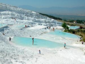 Чуть к югу от Самоса на турецком берегу можно легко найти на карте не менее прославленный античными историками город Милет. Но нас на этот раз интересует не история древней Эллады. Мы направимся с вами вверх по долине впадающей здесь в море реки Большой Мендерес, чтобы через полтораста километров оказаться у подножья потухшего вулкана Памуккале. Оказаться… и замереть от восторга и какого-то ощущения неправдоподобности открывшейся глазу картины. 150-метровый каскад застывших, сверкающих белизной водопадов почти трехкилометровой ширины опоясывает основание вулкана, и бесчисленные бассейны и чаши, наполненные бирюзовой водой, перемежаются с белоснежными ажурными кружевами из сталактитов и сталагмитов. Турецкое название Памуккале означает "хлопковая крепость". Действительно, каскады и террасы Памуккале напоминают сказочный замок, сложенный из белого, словно вата, известкового туфа — травертина.