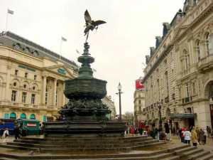 Алюминиевая статуя Эроса — ангела, символизирующего христианскую любовь к ближнему, — главная достопримечательность площади Пиккадилли. В греческой мифологии Эрос (Эрот) — бог любви. Он один из четырех космогонических первоначал, наряду с Хаосом, Геей и Тартаром. По мифографу V века до нашей эры Акусилаго, Эрос, Эфир и Метида — дети Эреба и Ночи, происшедших от Хаоса. У Парменида Эрос мыслится также древнейшим божеством, которое создала Афродита. У орфиков он Протогон («перворожденный»), Фанет («явленный»), Фаэтон («сияющий»). Эрос — смелый стрелок, крылатый, многоискусный, владыка ключей эфира, неба, моря, земли, царства мертвых и тартара. По Ферекиду (VI век до нашей эры), сам Зевс, создавая мир, превратился в Эроса. Эрос, таким образом, мыслится всевластной мировой силой. Традиция классической поэзии делает Эроса сыном Зевса, порождением Ириды и Зефира, сыном Афродиты и Ареса, так что он постепенно принимает черты «златокрылого», «золотоволосого», «подобного ветру» бога, знаменуя постепенный переход к изящному, легкому, капризному Эросу эллинистической поэзии.